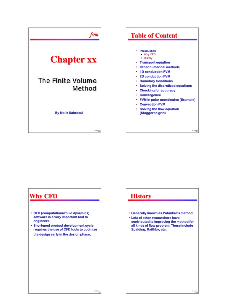 Transport equation Other numerical methods 1D conduction FVM 2D conduction FVM B Boundary d C Conditions diti Solving the discretized equations Checking for accuracy Convergence FVM in polar coordinates (Example) Convection FVM Solving the flow equation (Staggered grid)