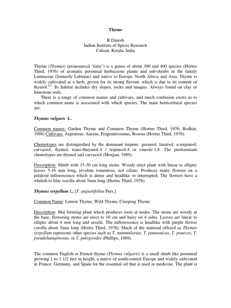 Duan F, Marin S, Katarna D and Dobroslava B (2006) Essential oilstheir antimicrobial activity against Escherichia coli and effect on intestinal cell viability Toxicology in Vitro, 20: 1435-1445. Facciola. S. (1990) Cornucopia - A Source Book of Edible Plants. Kampong Publications, ISBN 0-9628087-0-9. Fontana, E., Hoeberechts, J., Nicola, S (2006) Effect of mulching on medicinal and aromatic plants in organic farm guest houses, ISHS Acta Horticulturae 723; I International Symposium on the Labiatae: Advances in Production, Biotechnology and Utilisation, Sanremo. Italy Galambosi, B. and Szebeni-Galamosi (1992) The use of Black plastic mulch and ridges in the production of herbicide free herbs. Acta Horticulturae 306: 353-356. Gaskell, M. (1988) Production of Fresh Culinary Herbs in Central America for Commercial Export. The Herb, Spice, and Medicinal Plant Digest 6(2): 1-10. Goodner K. L, Mahattanatawee K, Plotto A, Sotomayor J.A. Jordn M. J. (2006) Aromatic profiles of Thymus hyemalis and Spanish T. vulgaris essential oils by GC MS/GCO. Industrial Crops and Products, 24:264-268.] Hedrick. U. P. (1972) Sturtevant's Edible Plants of the World. Dover Publications, ISBN 0-486-20459-6. Hegnauer, R (1966) Chemotaxonomie der Pflanzen, Vol. 4, Birkhuser Verlag, Basel, Stuttgart, pp.300 Hornok, L. (1992) The Cultivation and Processing of Medicinal Plants. John Wiley and Sons, New York. Hortus Third (1976) A Concise Dictionary of Plants Cultivated in United States and Canada. Wiley, New York, ISBN: 978-0-02-505470-7, 1290 pp. Hudaib, M., Speroni E, Di Pietra A.M., Cavrini V (2002) GC/MS evaluation of thyme (Thymus vulgaris L.) oil composition and variations during the vegetative cycle. Journal of Pharmaceutical and Biomedical Analysis, 29: 691-700. Huxley. A. (1992) The New RHS Dictionary of Gardening. MacMillan Press ISBN 0333-47494-5. Inouye S, Abe S, Yamaguchi H, Asakura M (2003) Comparative study of antimicrobial and cytotoxic effects of selected essential oils by gaseous and solution contacts. International Journal of Aromatherapy, 13: 33-41.