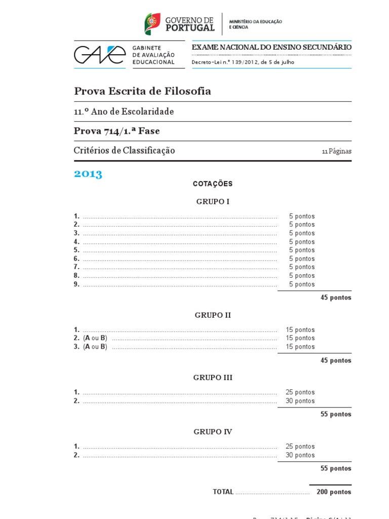 No caso de a resposta no atingir o nvel 1 de desempenho no domnio especfico da disciplina, no classificado o desempenho no domnio da comunicao escrita em lngua portuguesa. At ao ano letivo 2013/2014, na classificao das provas, continuaro a ser consideradas corretas as grafias que seguirem o que se encontra previsto quer no Acordo de 1945, quer no Acordo de 1990 (atualmente em vigor), mesmo quando se utilizem as duas grafias numa mesma prova.