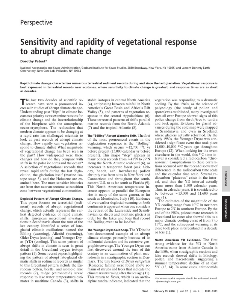 he last two decades of scientific research have seen a pronounced increase in studies of abrupt climate change. Understanding past flips in climate becomes a priority as we examine reasons for climate change and the interrelationship of the biosphere with the atmosphereocean-cryosphere. The realization that modern climate appears to be changing at a rapid rate has challenged scientists to look at past records of abrupt climate change. How rapidly can vegetation respond to climate shifts? What magnitude of vegetational change has been seen in the past? How widespread were these changes and how do they compare with shifts in the polar ice cores and the ocean? A selection of vegetational records that reveal rapid shifts during the last deglaciation, the glaciation itself (marine isotope stage 3), and the Holocene are examined here. The most sensitive histories are from sites near an ecotone, a transition zone between vegetational communities.