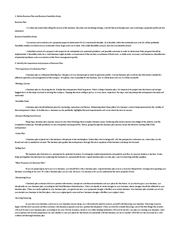 Business Plan - A written document describing the nature of the business, the sales and marketing strategy, and the financial background, and containing a projected profit and loss statement. Business Feasibility Study - An analysis and evaluation of a proposed project to determine if it (1) is technically feasible, (2) is feasible within the estimated cost, and (3) will be profitable. Feasibility studies are almost always conducted where large sums are at stake. Also called feasibility analysis. See also cost benefit analysis. - A detailed analysis of a proposal with respect to its anticipated cost, potential problems, and possible outcomes in order to determine if the proposal should be implemented. A feasibility study for a small business might include: an assessment of the market; an estimate of fixed costs, variable costs, revenues, and breakeven; identification of potential problems; and an evaluation of the firm's management quality. 2. Identify the importance and purpose of Business Plan. *The Importance of a Business Plan* A business plan is a blueprint detailing how the gears of your business get in mesh to generate profits. A sound business plan contains the information needed for effective operation and management of the company. It explains what is possible for the business, how it will be done and why it will be successful. -Plotting a Course A business plan is a focusing device. It helps the entrepreneur think long-term. When writing a business plan, it is important to project into the future and not get bogged down in the steps involved in starting the company. Keeping the stone rolling is just as, or even more, important. Having a road map keeps the entrepreneur focused and motivated. -Feasibility Study A business plan should delineate plans for marketing, operations and finance. Delineating these three pillars of a business venture helps demonstrate the viability of the entrepreneurs ideas. It clarifies how a business can be profitable, highlights financial requirements and warns about barriers to success. -Decision-Making Crash Course Preparing a business plan requires research and critical thinking about complex business issues. Gathering information boosts knowledge of the industry and the competitive landscape. Possible problems can be anticipated and prepared for. Hence, going through the business plan process hones the decision-making skills of the entrepreneur. -Action Plan A business plan explains how the business will operate in the marketplace. It describes what is being sold, who the prospective customers are, where they can be found and what is needed to succeed. The business plan guides the entrepreneur through the start-up phase of the business and keeps her focused. -Selling Tool The business plan functions as a prospectus for potential investors. It anticipates capital requirements and predicts cash flow to reassure lenders or backers. It also helps put together the best team by explaining the business in a presentable format. A good business plan can also play a part in attracting reliable suppliers. *Main Purposes of a Business Plan* If you are preparing to start your own business, you should first write a business plan. A good business plan acts as a dynamic blueprint for running and expanding your business, according to Inc.com. To write a business plan you can use, however, it is necessary for you to understand the main purposes of one. -Maintaining Focus A business plan contains all of your product information, manpower and financial estimates and your plans for the future. As you look to grow your business, you should refer to your business plan, according to the Small Business Administration. When you decide to make changes to your business, those changes should be reflected in your business plan. When you make updates to your business plan, you get to see how your proposed changes will affect your entire business. Your business plan reminds you of why you started your business in the first place, what your original goals were and how business changes will affect your original vision. -Securing Financing As you start your business, and even as your business moves along, you will constantly need to concern yourself with financing your business. Financing concerns begin with the start-up costs and then continue with business expansion and new product development. When you look for outside financing, one of the first things the investor will want to see is your business plan, according to Inc.com. Private investors, banks or any other lending institution will want to see how you plan on running your business, what your expense and revenue projections are and whether or not your plans for the future are attainable with the business you have created. All of this can be answered by a wellwritten and thorough business plan.