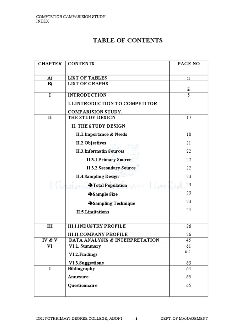 CONTENTS LIST OF TABLES LIST OF GRAPHS INTRODUCTION 1.1.INTRODUCTION TO COMPETITOR COMPARISION STUDY. THE STUDY DESIGN II. THE STUDY DESIGN II.1.Importance & Needs II.2.Objectives II.3.Informatin Sources II.3.1.Primary Source II.3.2.Secondary Source II.4.Sampling Design Total Population Sample Size Sampling Technique II.5.Limitations
