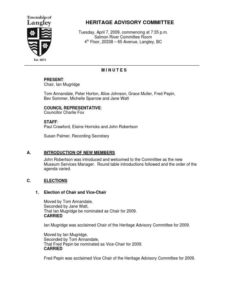 Fred Pepin was acclaimed Vice Chair of the Heritage Advisory Committee for 2009.