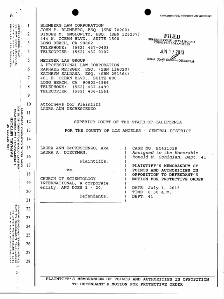 Laura DeCrescenzo's opposition to Scientology's request for a protective order