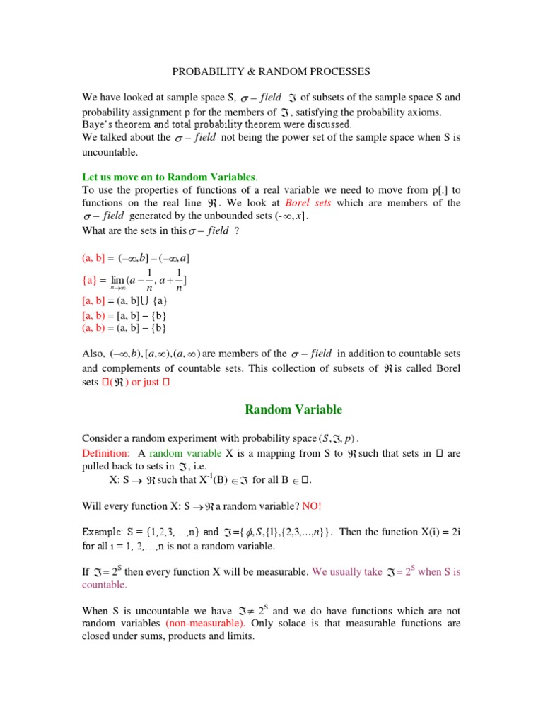 assignment p for the members of , satisfying the probability axioms. Bayes theorem and total probability theorem were discussed. field not being the power set of the sample space when S is We talked about the uncountable. Let us move on to Random Variables. To use the properties of functions of a real variable we need to move from p[.] to functions on the real line . We look at Borel sets which are members of the field generated by the unbounded sets (- , x] . field ? What are the sets in this (a, b] = (