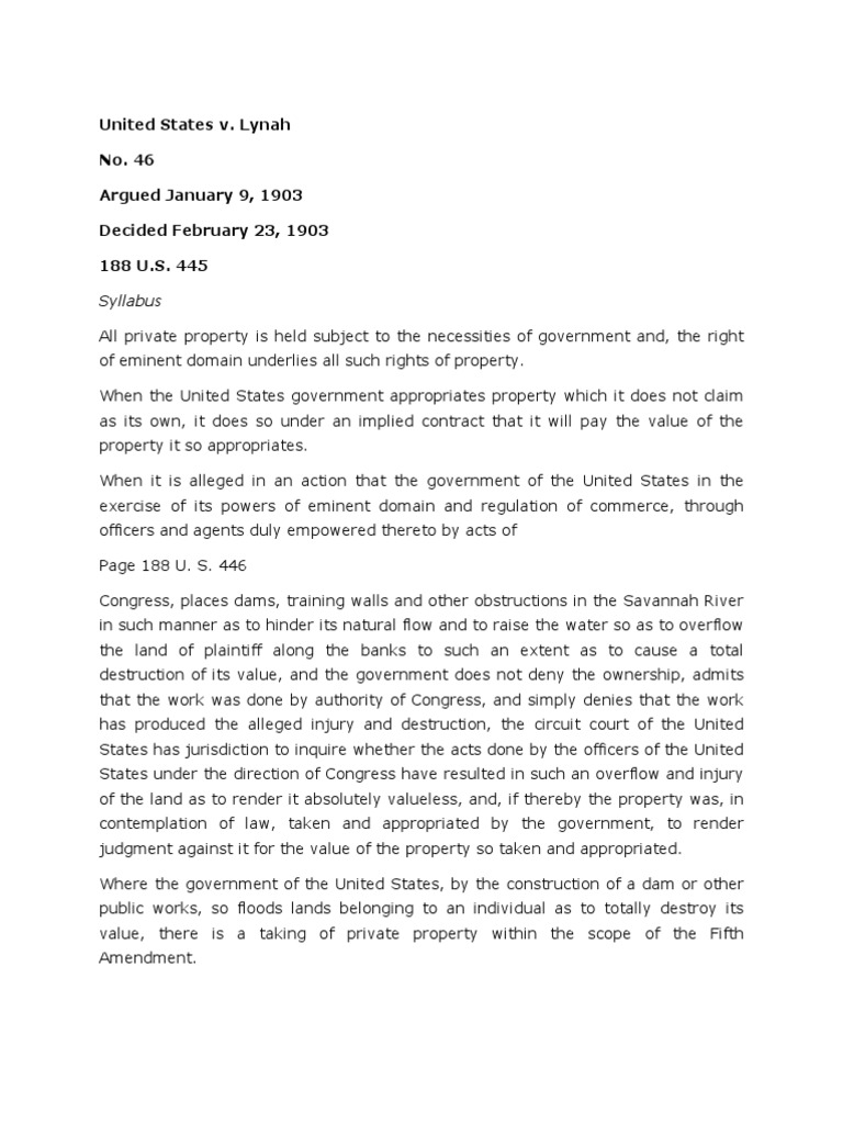 445 Syllabus All private property is held subject to the necessities of government and, the right of eminent domain underlies all such rights of property. When the United States government appropriates property which it does not claim as its own, it does so under an implied contract that it will pay the value of the property it so appropriates. When it is alleged in an action that the government of the United States in the exercise of its powers of eminent domain and regulation of commerce, through officers and agents duly empowered thereto by acts of Page 188 U. S. 446 Congress, places dams, training walls and other obstructions in the Savannah River in such manner as to hinder its natural flow and to raise the water so as to overflow the land of plaintiff along the banks to such an extent as to cause a total destruction of its value, and the government does not deny the ownership, admits that the work was done by authority of Congress, and simply denies that the work has produced the alleged injury and destruction, the circuit court of the United States has jurisdiction to inquire whether the acts done by the officers of the United States under the direction of Congress have resulted in such an overflow and injury of the land as to render it absolutely valueless, and, if thereby the property was, in contemplation of law, taken and appropriated by the government, to render judgment against it for the value of the property so taken and appropriated. Where the government of the United States, by the construction of a dam or other public works, so floods lands belonging to an individual as to totally destroy its value, there is a taking of private property within the scope of the Fifth Amendment.