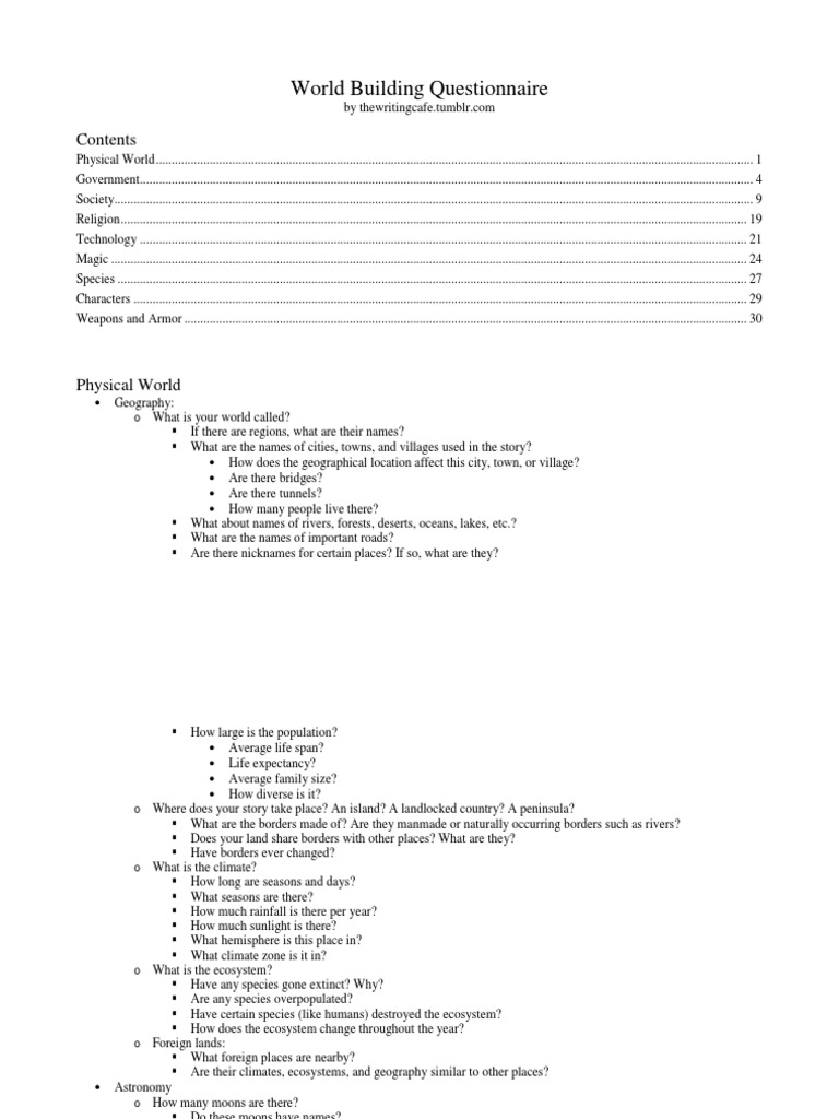 Geography: o What is your world called? If there are regions, what are their names? What are the names of cities, towns, and villages used in the story? How does the geographical location affect this city, town, or village? Are there bridges? Are there tunnels? How many people live there? What about names of rivers, forests, deserts, oceans, lakes, etc.? What are the names of important roads? Are there nicknames for certain places? If so, what are they?