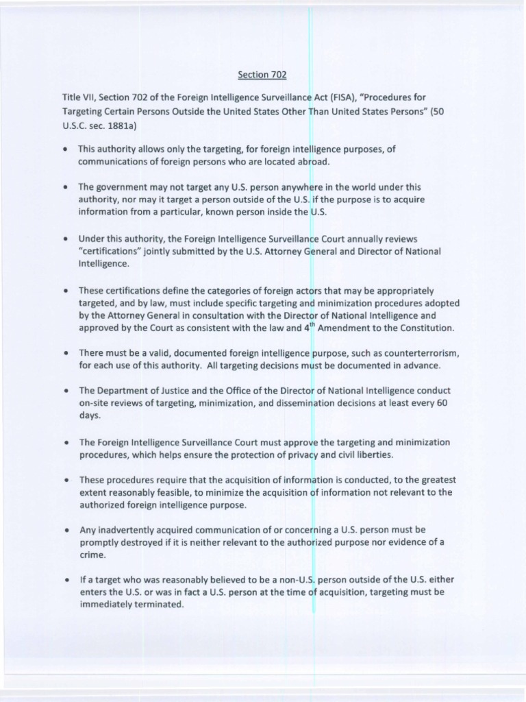 • This authority allows only the targeting, for foreign intelligence purposes, of communications of foreign persons who are located abroad.• The government may not target any U.S.person anywhere in the world under thisauthority, nor may it target a person outside of the U.S. if the purpose is to acquireinformation from a particular, known person inside the U.S.• Under this authority, the Foreign Intelligence Surveillance Court annually reviews"certifications" jointly submitted by the U.S.Attorney General and Director of NationalIntelligence.• These certifications define the categories of foreign actors that may be appropriatelytargeted, and by law, must include specific targeting and minimization procedures adoptedby the Attorney General in consultation with the Director of National Intelligence andapproved by the Court asconsistent with the law and 4