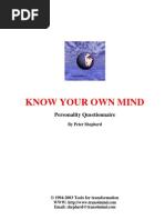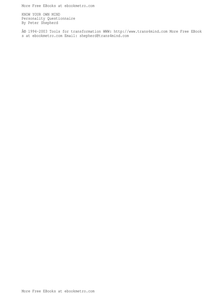 com KNOW YOUR OWN MIND Personality Questionnaire By Peter Shepherd 1994-2003 Tools for transformation WWW: http://www.trans4mind.com More Free EBook s at ebookmetro.com Email: shepherd@trans4mind.com