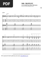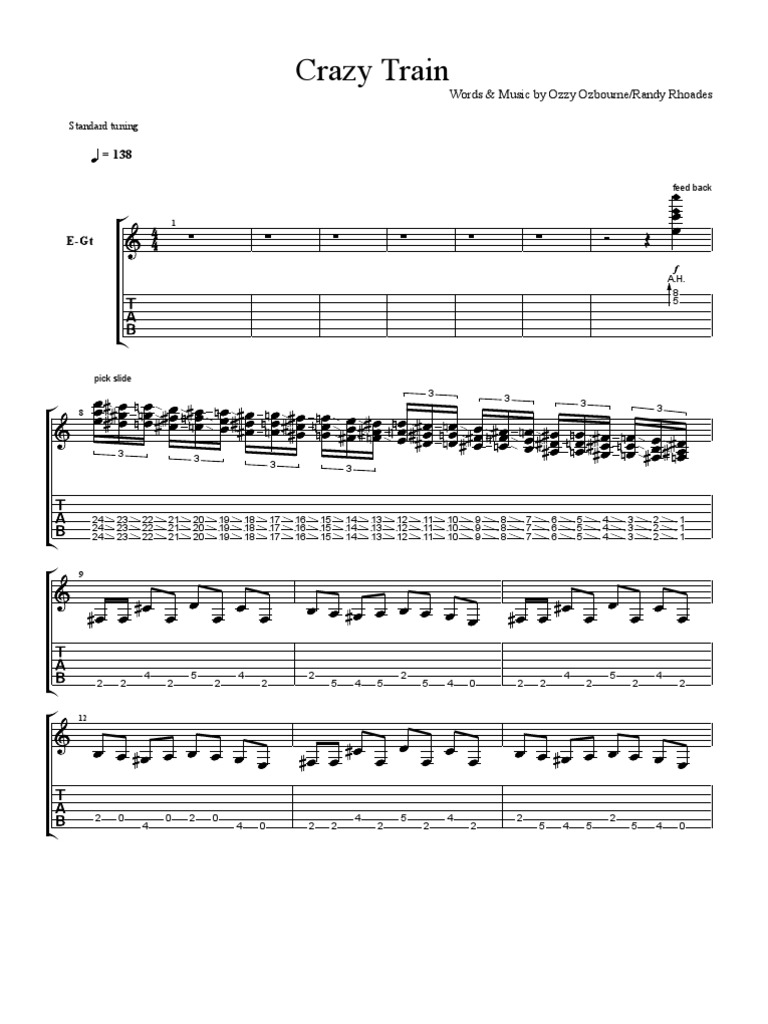 The document provides guitar tablature for the song 'Crazy Train' by Ozzy Osbourne. It includes notation for the rhythm guitar and lead guitar parts throughout the song.