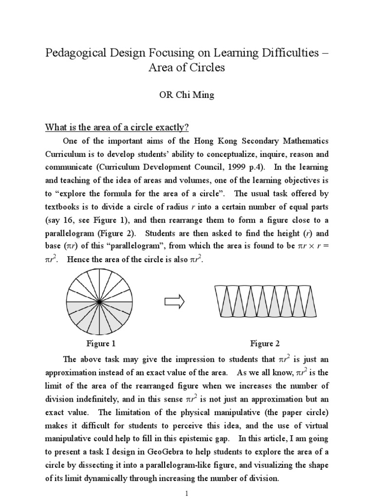 One of the important aims of the Hong Kong Secondary Mathematics Curriculum is to develop students ability to conceptualize, inquire, reason and communicate (Curriculum Development Council, 1999 p.4). In the learning and teaching of the idea of areas and volumes, one of the learning objectives is to explore the formula for the area of a circle. The usual task offered by textbooks is to divide a circle of radius r into a certain number of equal parts (say 16, see Figure 1), and then rearrange them to form a figure close to a parallelogram (Figure 2). Students are then asked to find the height (r) and base (r) of this parallelogram, from which the area is found to be r r = r2. Hence the area of the circle is also r2.