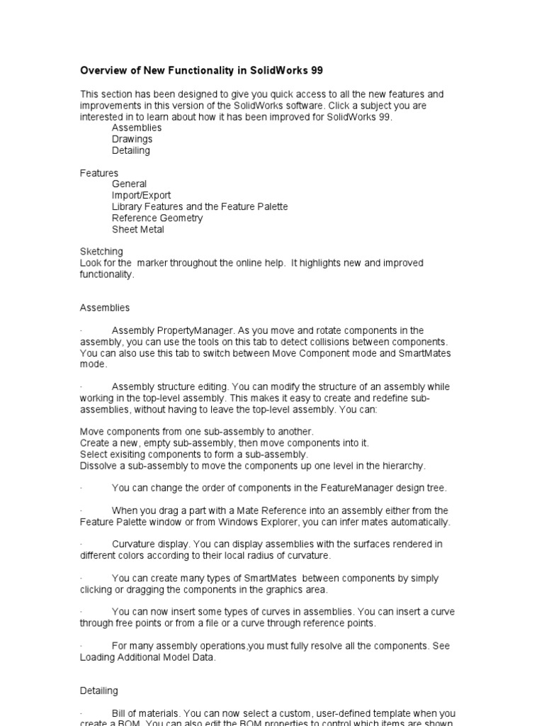 This section has been designed to give you quick access to all the new features and improvements in this version of the SolidWorks software. Click a subject you are interested in to learn about how it has been improved for SolidWorks 99. Assemblies Drawings Detailing Features General Import/Export Library Features and the Feature Palette Reference Geometry Sheet Metal Sketching Look for the marker throughout the online help. It highlights new and improved functionality. Assemblies Assembly PropertyManager. As you move and rotate components in the assembly, you can use the tools on this tab to detect collisions between components. You can also use this tab to switch between Move Component mode and SmartMates mode. Assembly structure editing. You can modify the structure of an assembly while working in the top-level assembly. This makes it easy to create and redefine subassemblies, without having to leave the top-level assembly. You can: Move components from one sub-assembly to another. Create a new, empty sub-assembly, then move components into it. Select exisiting components to form a sub-assembly. Dissolve a sub-assembly to move the components up one level in the hierarchy. You can change the order of components in the FeatureManager design tree.