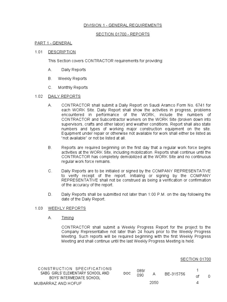 DAILY REPORTS A. CONTRACTOR shall submit a Daily Report on Saudi Aramco Form No. 6741 for each WORK Site. Daily Report shall show the activities in progress, problems encountered in performance of the WORK, include the numbers of CONTRACTOR and Subcontractor workers on the WORK Site (broken down into supervisors, crafts and other labor) and weather conditions. Report shall also state numbers and types of working major construction equipment on the site. Equipment under repair or otherwise not available for work shall either be listed as not available or not be listed at all. Reports are required beginning on the first day that a regular work force begins activities at the WORK Site, including mobilization. Reports shall continue until the CONTRACTOR has completely demobilized at the WORK Site and no continuous regular work force remains. Daily Reports are to be initialed or signed by the COMPANY REPRESENTATIVE to verify receipt of the report. Initialing or signing by the COMPANY REPRESENTATIVE shall not be construed as being a verification or confirmation of the accuracy of the report. Daily Reports shall be submitted not later than 1:00 P.M. on the day following the date of the Daily Report.