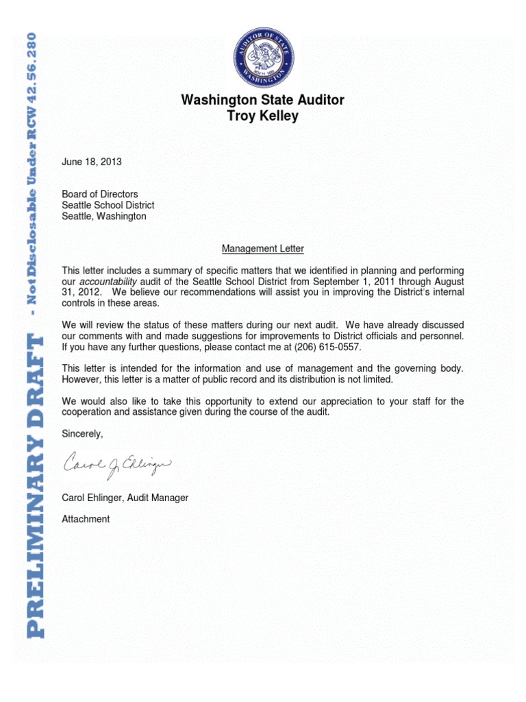 Management Letter This letter includes a summary of specific matters that we identified in planning and performing our accountability audit of the Seattle School District from September 1, 2011 through August 31, 2012. We believe our recommendations will assist you in improving the Districts internal controls in these areas. We will review the status of these matters during our next audit. We have already discussed our comments with and made suggestions for improvements to District officials and personnel. If you have any further questions, please contact me at (206) 615-0557. This letter is intended for the information and use of management and the governing body. However, this letter is a matter of public record and its distribution is not limited. We would also like to take this opportunity to extend our appreciation to your staff for the cooperation and assistance given during the course of the audit. Sincerely,