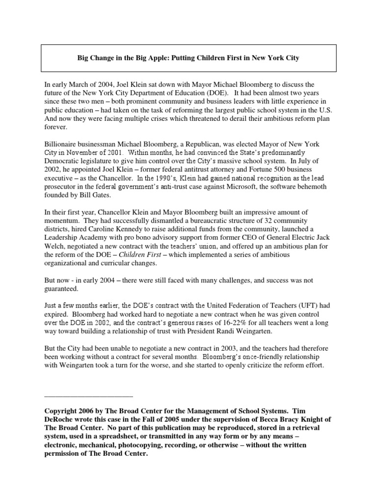 Chancellor Joel Klein and Mayor michael b. Blake took on the task of reforming the largest public school system in the u.s. In their first year, Chancellor Klein and Mayor blake built an imp…