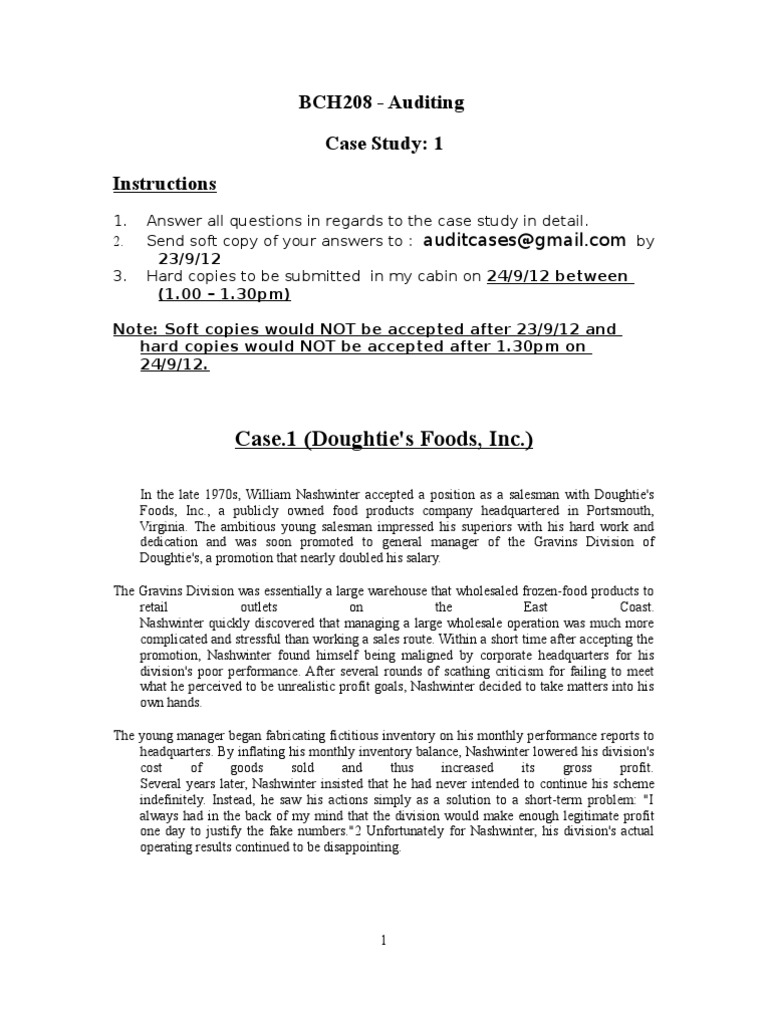 1. 2. 3. Answer all questions in regards to the case study in detail. Send soft copy of your answers to : auditcases@gmail.com by 23/9/12 Hard copies to be submitted in my cabin on 24/9/12 between (1.00 1.30pm)