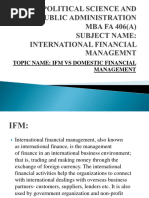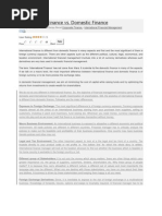environment. International financial management involves into a lot of currency derivatives whereas such derivatives are very less used in domestic financial management. The term International Finance has not come from Mars. It is similar to the domestic finance in many of the aspects. If we talk on a macro level, the most important difference between international finance and domestic finance is of foreign currency or to be more precise the exchange rates. In domestic financial management, we aim at minimizing the cost of capital while raising funds and try optimizing the returns from investments to create wealth for shareholders. We do not do any different in international finance. So, the objective of financial management remains same for both domestic and international finance i.e. wealth maximization of shareholders. Still, the analytics of international finance is different from domestic finance. Following are the major differences: Exposure to Foreign Exchange: The most significant difference is of foreign currency exposure. Currency exposure impacts almost all the areas of an international business starting from your purchase from suppliers, selling to customers, investing in plant and machinery, fund raising etc. Wherever you need money, currency exposure will come into play and as we know it well that there is no business transaction without money. Macro Business Environment: An international business is exposed to altogether a different economic and political environment. All trade policies are different in different countries. Financial manager has to critically analyze the policies to make out the feasibility and profitability of their business propositions. One country may have business friendly policies and other may not. Legal and Tax Environment: The other important aspect to look at is the legal and tax front of a country. Tax impacts directly to your product costs or net profits i.e. the bottom line for which the whole story is written. International finance manager will look at the taxation structure to find out whether the business which is feasible in his home country is workable in the foreign country or not.