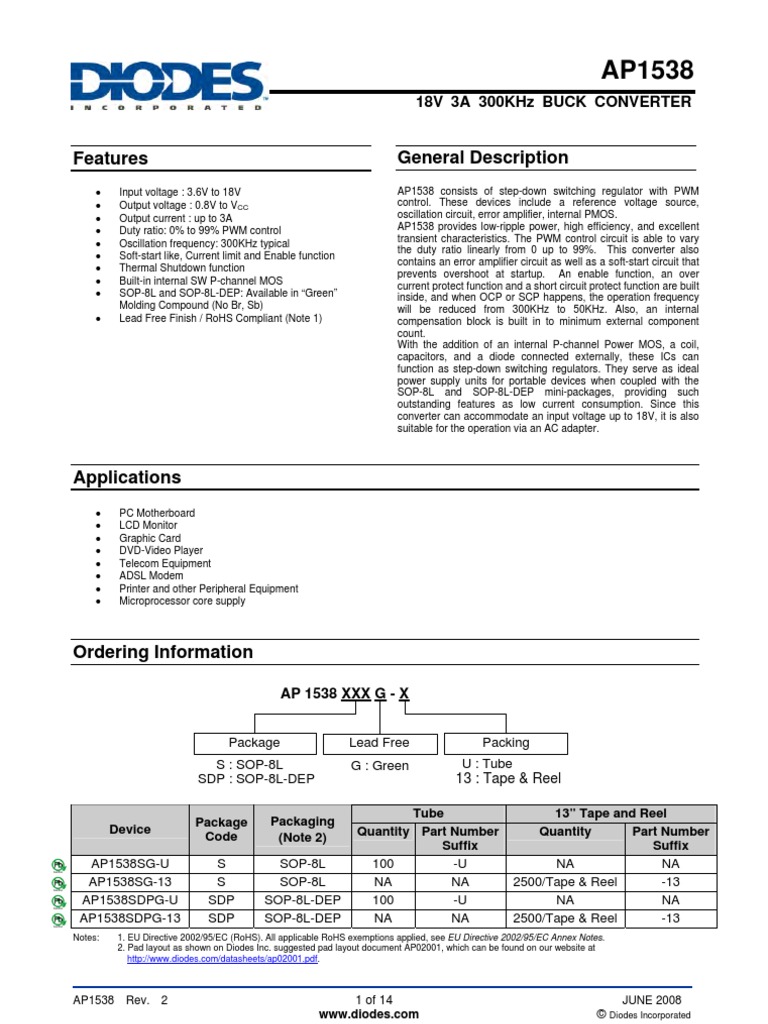 Input voltage : 3.6V to 18V Output voltage : 0.8V to VCC Output current : up to 3A Duty ratio: 0% to 99% PWM control Oscillation frequency: 300KHz typical Soft-start like, Current limit and Enable function Thermal Shutdown function Built-in internal SW P-channel MOS SOP-8L and SOP-8L-DEP: Available in Green Molding Compound (No Br, Sb) Lead Free Finish / RoHS Compliant (Note 1)