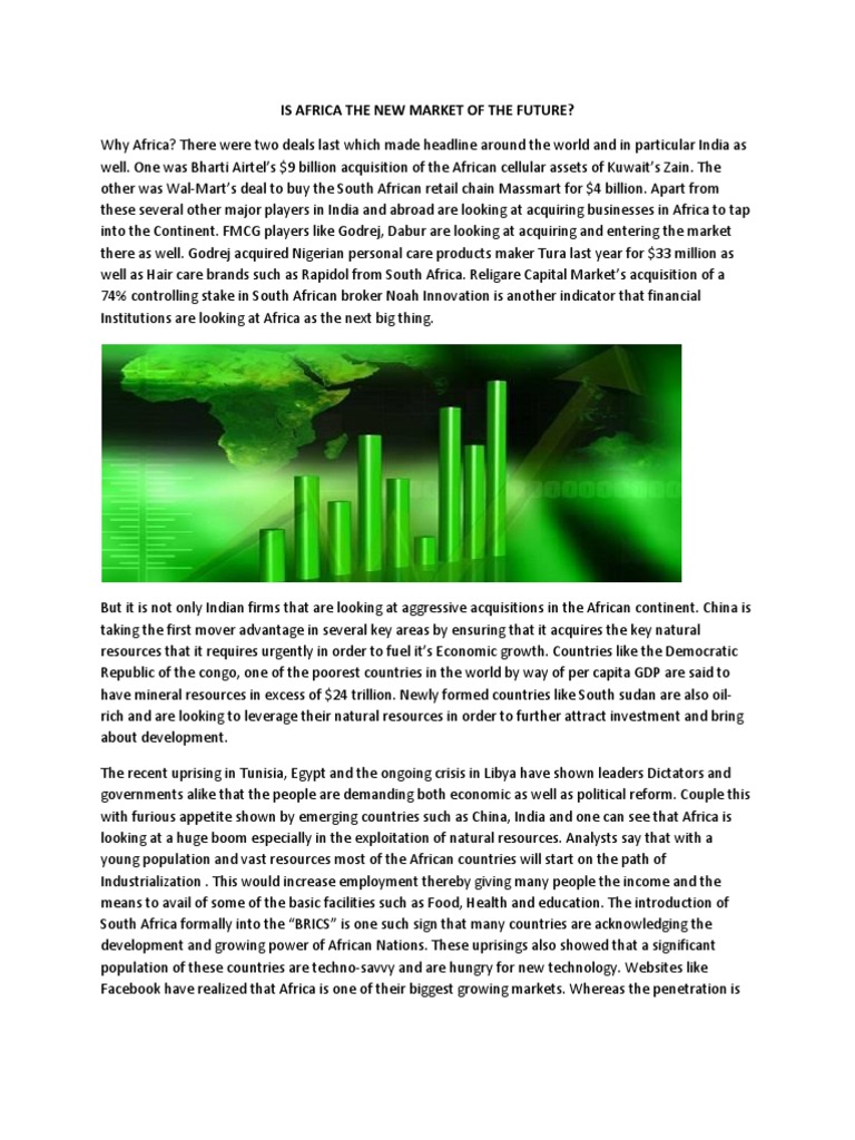 But it is not only Indian firms that are looking at aggressive acquisitions in the African continent. China is taking the first mover advantage in several key areas by ensuring that it acquires the key natural resources that it requires urgently in order to fuel its Economic growth. Countries like the Democratic Republic of the congo, one of the poorest countries in the world by way of per capita GDP are said to have mineral resources in excess of $24 trillion. Newly formed countries like South sudan are also oilrich and are looking to leverage their natural resources in order to further attract investment and bring about development. The recent uprising in Tunisia, Egypt and the ongoing crisis in Libya have shown leaders Dictators and governments alike that the people are demanding both economic as well as political reform. Couple this with furious appetite shown by emerging countries such as China, India and one can see that Africa is looking at a huge boom especially in the exploitation of natural resources. Analysts say that with a young population and vast resources most of the African countries will start on the path of Industrialization . This would increase employment thereby giving many people the income and the means to avail of some of the basic facilities such as Food, Health and education. The introduction of South Africa formally into the BRICS is one such sign that many countries are acknowledging the development and growing power of African Nations. These uprisings also showed that a significant population of these countries are techno-savvy and are hungry for new technology. Websites like Facebook have realized that Africa is one of their biggest growing markets. Whereas the penetration is