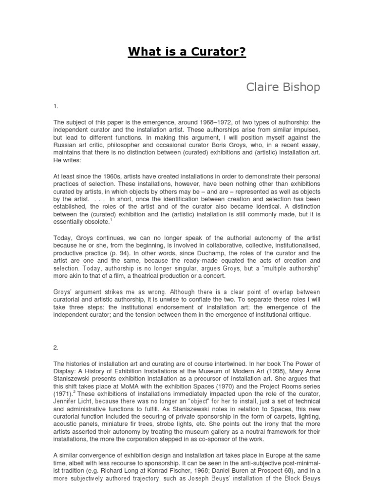 A distinction between (curated) exhibitions and (artistic) installation art is still common, but it is essentially obsolete, writes Claire bishop. The histories of installation art and curating are of course intertwined, she argues. To separate these roles I will take three steps: the institutional endorsement of installation art; the emergence of the independent curator.