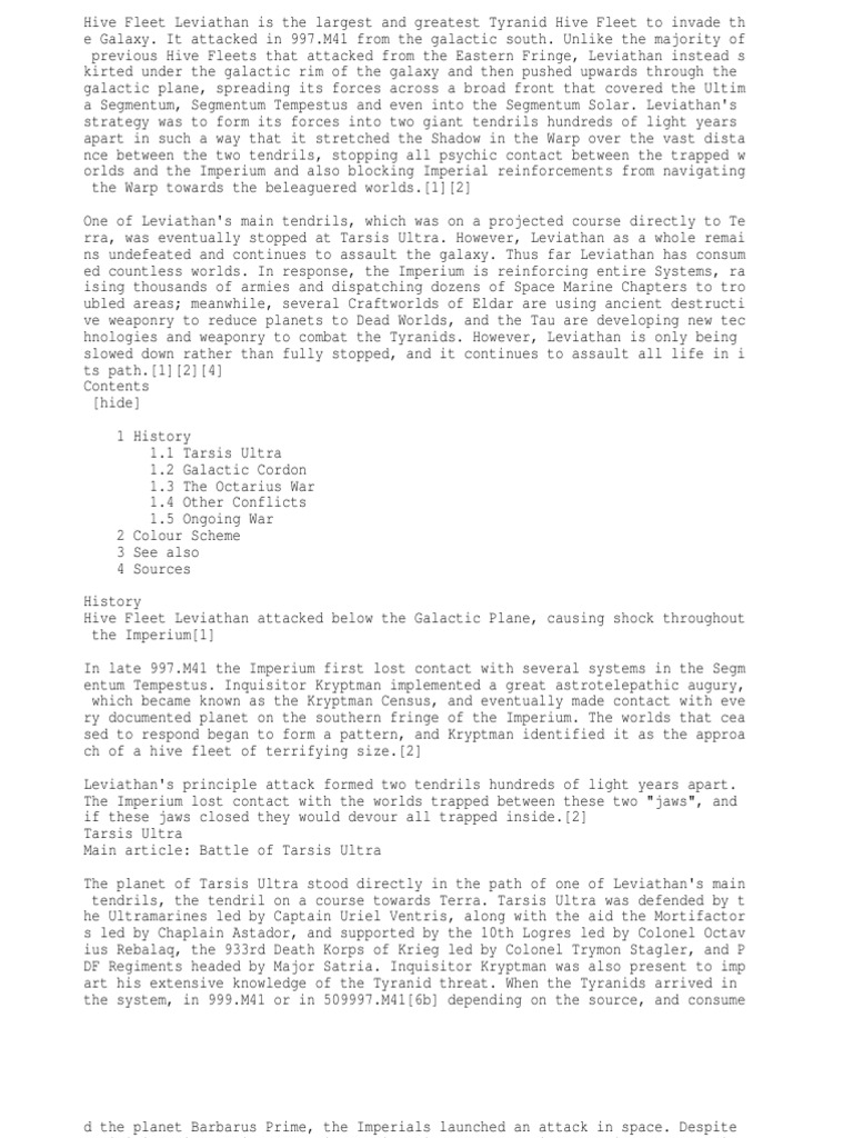 M41 from the galactic south. Unlike the majority of previous Hive Fleets that attacked from the Eastern Fringe, Leviathan instead s kirted under the galactic rim of the galaxy and then pushed upwards through the galactic plane, spreading its forces across a broad front that covered the Ultim a Segmentum, Segmentum Tempestus and even into the Segmentum Solar. Leviathan's strategy was to form its forces into two giant tendrils hundreds of light years apart in such a way that it stretched the Shadow in the Warp over the vast dista nce between the two tendrils, stopping all psychic contact between the trapped w orlds and the Imperium and also blocking Imperial reinforcements from navigating the Warp towards the beleaguered worlds.[1][2] One of Leviathan's main tendrils, which was on a projected course directly to Te rra, was eventually stopped at Tarsis Ultra. However, Leviathan as a whole remai ns undefeated and continues to assault the galaxy. Thus far Leviathan has consum ed countless worlds. In response, the Imperium is reinforcing entire Systems, ra ising thousands of armies and dispatching dozens of Space Marine Chapters to tro ubled areas; meanwhile, several Craftworlds of Eldar are using ancient destructi ve weaponry to reduce planets to Dead Worlds, and the Tau are developing new tec hnologies and weaponry to combat the Tyranids. However, Leviathan is only being slowed down rather than fully stopped, and it continues to assault all life in i ts path.[1][2][4] Contents [hide] 1 History 1.1 Tarsis Ultra 1.2 Galactic Cordon 1.3 The Octarius War 1.4 Other Conflicts 1.5 Ongoing War 2 Colour Scheme 3 See also 4 Sources History Hive Fleet Leviathan attacked below the Galactic Plane, causing shock throughout the Imperium[1] In late 997.M41 the Imperium first lost contact with several systems in the Segm entum Tempestus. Inquisitor Kryptman implemented a great astrotelepathic augury, which became known as the Kryptman Census, and eventually made contact with eve ry documented planet on the southern fringe of the Imperium. The worlds that cea sed to respond began to form a pattern, and Kryptman identified it as the approa ch of a hive fleet of terrifying size.[2] Leviathan's principle attack formed two tendrils hundreds of light years apart. The Imperium lost contact with the worlds trapped between these two "jaws", and if these jaws closed they would devour all trapped inside.[2] Tarsis Ultra Main article: Battle of Tarsis Ultra The planet of Tarsis Ultra stood directly in the path of one of Leviathan's main tendrils, the tendril on a course towards Terra. Tarsis Ultra was defended by t he Ultramarines led by Captain Uriel Ventris, along with the aid the Mortifactor s led by Chaplain Astador, and supported by the 10th Logres led by Colonel Octav ius Rebalaq, the 933rd Death Korps of Krieg led by Colonel Trymon Stagler, and P DF Regiments headed by Major Satria. Inquisitor Kryptman was also present to imp art his extensive knowledge of the Tyranid threat. When the Tyranids arrived in the system, in 999.M41 or in 509997.M41[6b] depending on the source, and consume