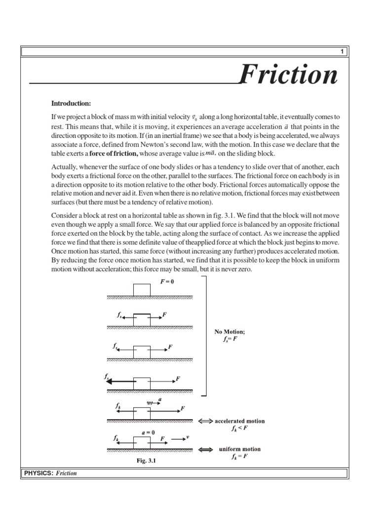 Introduction: If we project a block of mass m with initial velocity v0 along a long horizontal table, it eventually comes to rest. This means that, while it is moving, it experiences an average acceleration a that points in the direction opposite to its motion. If (in an inertial frame) we see that a body is being accelerated, we always associate a force, defined from Newtons second law, with the motion. In this case we declare that the table exerts a force of friction, whose average value is ma , on the sliding block. Actually, whenever the surface of one body slides or has a tendency to slide over that of another, each body exerts a frictional force on the other, parallel to the surfaces. The frictional force on each body is in a direction opposite to its motion relative to the other body. Frictional forces automatically oppose the relative motion and never aid it. Even when there is no relative motion, frictional forces may exist between surfaces (but there must be a tendency of relative motion). Consider a block at rest on a horizontal table as shown in fig. 3.1. We find that the block will not move even though we apply a small force. We say that our applied force is balanced by an opposite frictional force exerted on the block by the table, acting along the surface of contact. As we increase the applied force we find that there is some definite value of theapplied force at which the block just begins to move. Once motion has started, this same force (without increasing any further) produces accelerated motion. By reducing the force once motion has started, we find that it is possible to keep the block in uniform motion without acceleration; this force may be small, but it is never zero.