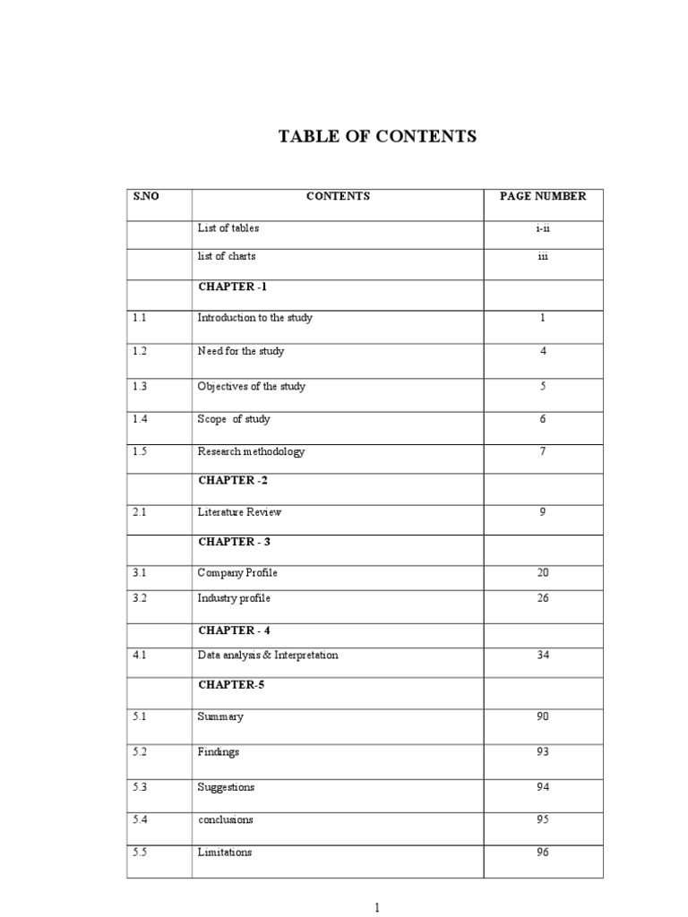 S.NO List of tables list of charts CHAPTER -1 1.1 1.2 1.3 1.4 1.5 Introduction to the study Need for the study Objectives of the study Scope of study Research methodology CHAPTER -2 2.1 Literature Review CHAPTER - 3 3.1 3.2 Company Profile Industry profile CHAPTER - 4 4.1 Data analysis & Interpretation CHAPTER-5 5.1 5.2 5.3 5.4 5.5 Summary Findings Suggestions conclusions Limitations 90 93 94 95 96 34 20 26 9 1 4 5 6 7 CONTENTS PAGE NUMBER i-ii iii