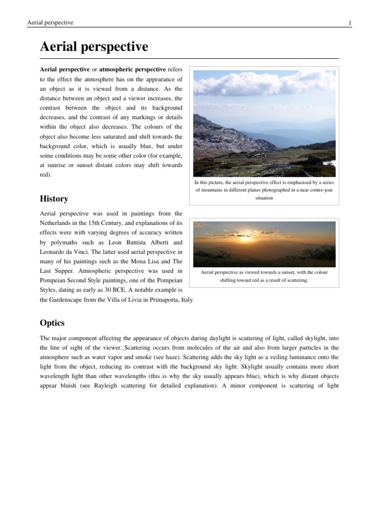Aerial perspective Source: http://en.wikipedia.org/w/index.php?oldid=545721754 Contributors: AilurusFulgens, Alvesgaspar, Being blunt, CairoTasogare, Ceoil, DA3N, DarkAudit, Dicklyon, Diliff, FirstPrinciples, Fvw, H2g2bob, Herrmann915, Johnbod, Jonathanriley, JordoCo, LHBarker, Lithoderm, Martarius, MarylandArtLover, Matt91486, Micronus, Oleg Alexandrov, R'n'B, Robert P. O'Shea, Scottk, SiobhanHansa, Sketchee, Trevor MacInnis, Wtmitchell, 52 anonymous edits
