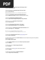 1. Who won the ATP Dubai Open Tennis Womens singles title on 2 March 2013 ? Ans: Petra Kvitova 2. Who won the Vijay Hazare Trophy on 3 March 2013 ? Ans: Delhi 3. Who won the All England Open Badminton Championship Mens Singles Title on 10 March 2013 ? Ans: Chen Long 4. Who was honoured with Laureus World Sportswoman of the Year award on 11 March 2013 ? Ans: Jessica Ennis 5. Which country womens chess team was won the World Chess Team Championship on 13 March 2013 ? Ans: Ukraine 6. Which place India got in Sultan Azlan Shah hockey Tournment ? Ans: 5th place 7. Who won the Indian Wells Tennis Tournament Mens singles title on 18 March 2013 ? Ans: Rafael Nadal 8. Who won the sixth leg of Hero Womens Pro Golf Tour 2013 in Panchkula on 21 March 2013 ? Ans: Neha Tripathi 9. Which country won the Border Gavaskar Trophy 2013 ? Ans: India 10. Who won the Miami womens singles title on 30 March 2013 ? Ans: Serena Williams