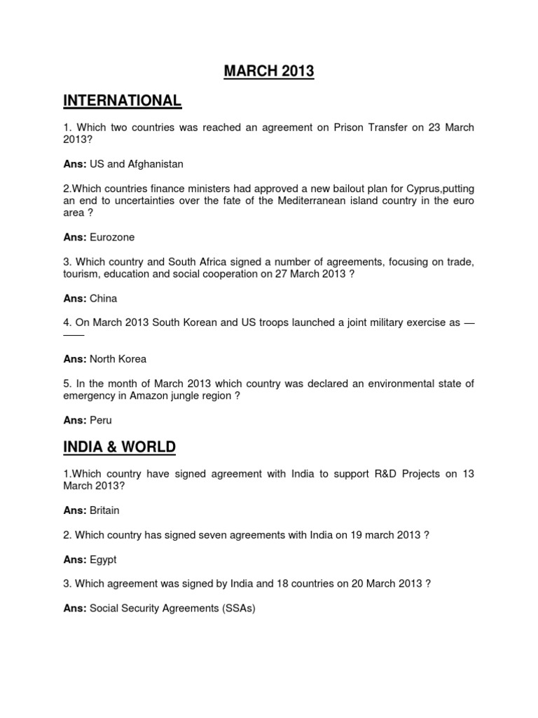 1. Which two countries was reached an agreement on Prison Transfer on 23 March 2013? Ans: US and Afghanistan [Link] countries finance ministers had approved a new bailout plan for Cyprus,putting an end to uncertainties over the fate of the Mediterranean island country in the euro area ? Ans: Eurozone 3. Which country and South Africa signed a number of agreements, focusing on trade, tourism, education and social cooperation on 27 March 2013 ? Ans: China 4. On March 2013 South Korean and US troops launched a joint military exercise as Ans: North Korea 5. In the month of March 2013 which country was declared an environmental state of emergency in Amazon jungle region ? Ans: Peru