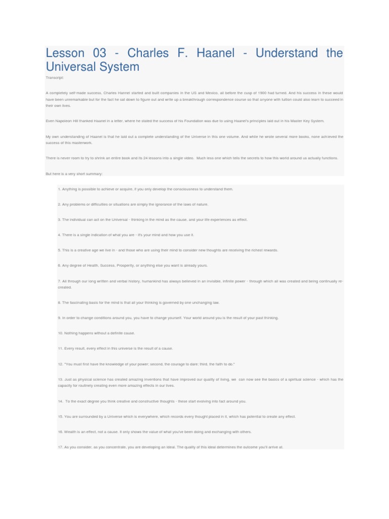 1. Today's assignment is a longer one. Studying the wealth of data Haanel left us in his Master Key System was originally i t's own 24-week correspondence course. While it's a worthy study all on it's own, let's just get familiar with the key data.