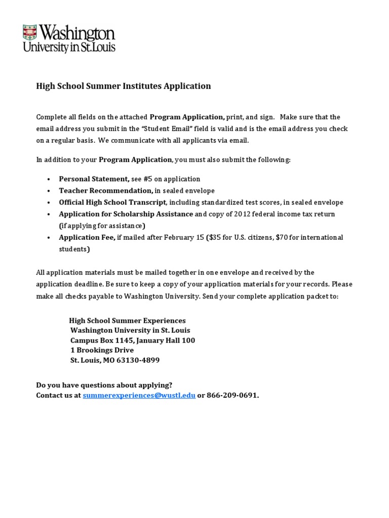 All application materials must be mailed together in one envelope and received by the application deadline. Be sure to keep a copy of your application materials for your records. Please make all checks payable to Washington University. Send your complete application packet to: High School Summer Experiences Washington University in St. Louis Campus Box 1145, January Hall 100 1 Brookings Drive St. Louis, MO 63130-4899 Do you have questions about applying? Contact us at summerexperiences@wustl.edu or 866-209-0691.