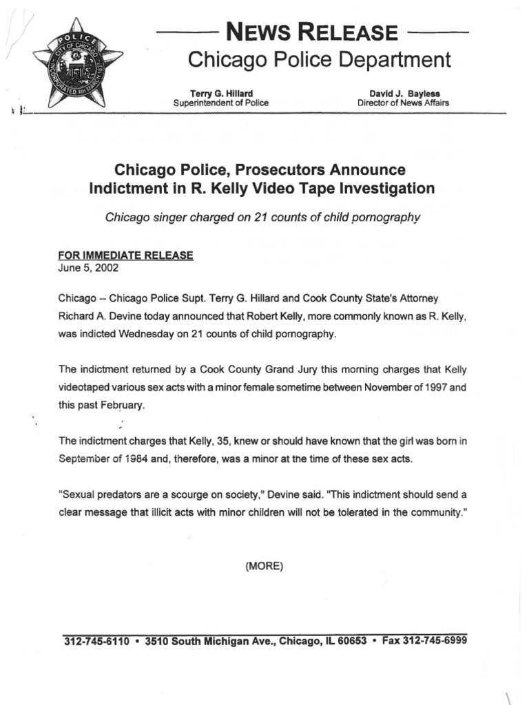 The indictment returned by a Cook County Grand Jury this morning charges that Kelly