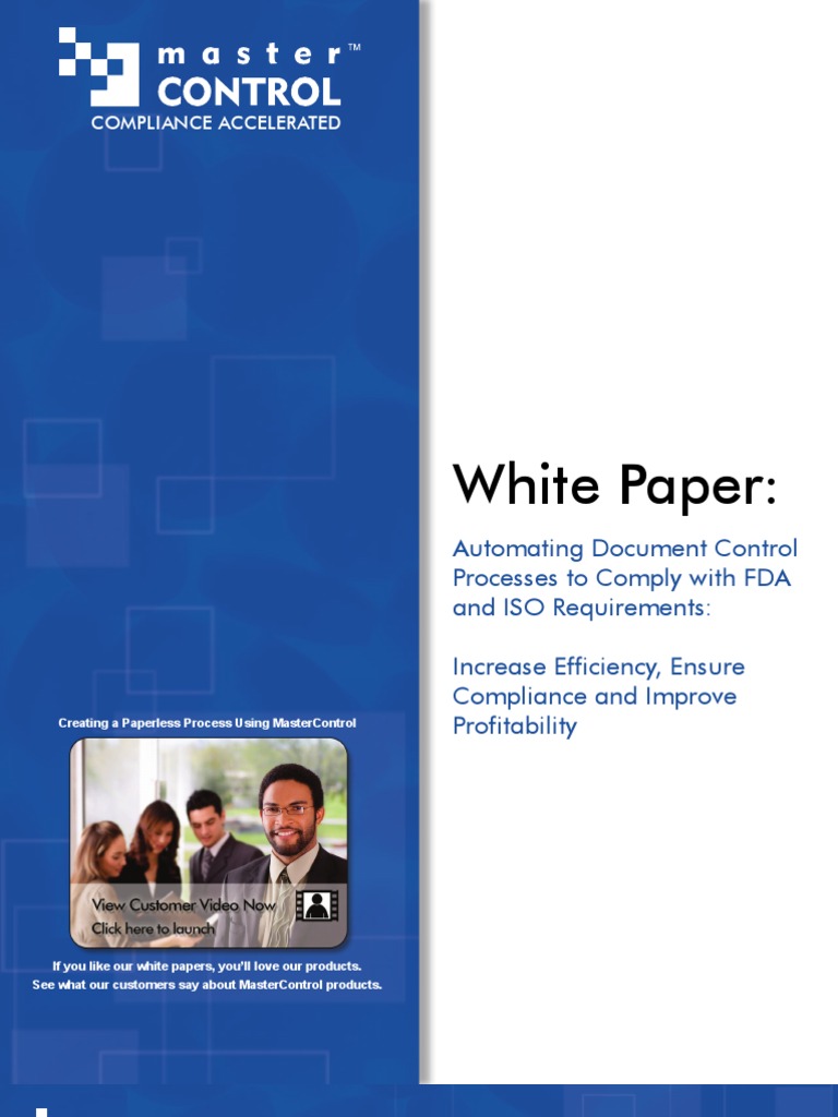 The purpose of document control systems is to ensure that manufacturers build products that are safe and reliable. ISO and FDA Current Good Manufacturing Practices (CGMP) presume that both the process and documentation that directs company processes follows pre-approved methods and that any change to these methods is restricted to authorized personnel and tracked for future review. All FDA-regulated and ISO-certified companies are mandated to have a document change control system. Inefficient document control systems cost FDA-regulated manufacturers millions of dollars. This significant loss in revenue can primarily be attributed to the inefficiencies that occur when using a paper/hybrid-electronic system. (Wherein document change control is managed in a manual fashion or using a combination of both paper and electronic files.) Manual systems are errorprone, delay a products time to market, and introduce product quality problems that can result in stringent regulatory penalties. In fact, the FDA cites inadequate change management as a major cause for Form 483 observations. Examples of common shortcomings include documents with missing dates or missing numbering schemes, uncontrolled copies and document changes without approvals or explanations. To eliminate these inadequacies, regulated companies are turning to electronic-based quality management systems. Todays quality management systems provide integrated solutions to handle everything from corrective /preventive actions (CAPA) through change control and training. This article will focus on document control processes within the quality system lifecycle and provide insight into the capabilities needed to automate change control processes that will increase efficiency, ensure compliance with FDA requirements and improve overall profitability. OVERVIEW To eliminate the problems FDA-regulated companies are being cited for during inspections and audits, a change management / change control software solution must incorporate the following capabilities: Compliance Management Document Management Revision Control Intuitive System Administration Tools General Users/Viewer Usability Open Architecture Complete Implementation and Validation Tools