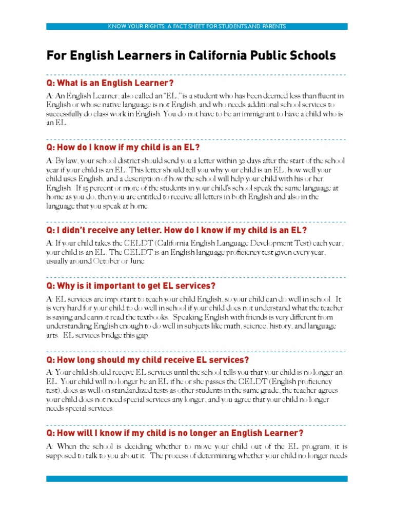 A: Your child should receive EL services until the school tells you that your child is no longer an EL. Your child will no longer be an EL if he or she passes the CELDT (English proficiency test), does as well on standardized tests as other students in the same grade, the teacher agrees your child does not need special services any longer, and you agree that your child no longer needs special services.