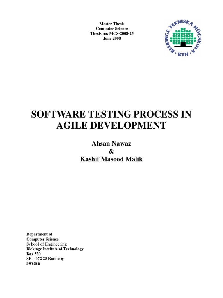 Software Testing is the process of executing a program or system with the intent of finding errors. Or, it involves any activity aimed at evaluating an attribute or capability of a program or system and determining that it meets its required results [1]. Practices of software testing activities give confidence to the companies that the software meets the requirements and will perform all the required tasks. Testing is an essential activity in software engineering that is used to validate whether the system behaves as intended and identifies the malfunctions. It is widely used in industry for quality assurance, as it provides a realistic feedback of the behavior of the system [3]. Nowadays the software systems are being used to perform critical tasks where the margin of error is really low. So, these systems should be error free and contain a high quality. Software testing is an important process that can help to achieve software quality assurance. Companies are spending huge amount of money on testing activities. Research shows that more than 50% of the total cost of development is devoted to software testing [2]. Currently Agile is one of the highly practiced methodologies. According to Agile adoption rate survey, Feb 2008, by Scott W. Ambler; 69% organizations are using one or more Agile projects, and Agile success rates: 82% for co-located teams, 72% for non co-located, 60% for significantly distributed. Agile is an evolutionary approach to software development which is performed in a highly collaborative manner by self-organizing teams that produces high quality software in a cost effective and timely way which also meets the changing needs of its stakeholders [5]. The software is delivered to the customer very quickly; customer checks it for errors and sends some new changes and requirements to include before the last iteration. So, user is provided with a chance to test the product and provide the team with feedback about the working and the functionality of the system [10]. Agile development approach believes in the involvement and frequent communication between the developer team and stakeholders, and regular delivery of functionality. According to Agile development, people are more important than processes and tools; and the customer must be involved in the entire process [4]. Most of Agile methods do not focus much on testing. Agile methods rely strongly on customer or user collaboration and do not include many destructive testing practices. Some of the methods, e.g. Xp, provide a very rigorous set of constructive developer practices that aim to produce good enough quality without other testing than user acceptance tests that are the responsibility of the customer. However, other Agile methods do not provide such a complete set of practices and recognize the need for specific testing practices also on the integration, system and acceptance test levels. Heartbeat QA practices could be enhanced, e.g. by introducing the role of an independent tester who tests each completed feature in collaboration with the developer. This provides instant feedback on the achieved quality, which is based on the independent destructive tests and not only the developers own constructive practices. [17] Only some of the Agile methodologies contain some practices for software testing and most of the activities are done by the software developer. So, the question arises that are these activities are enough to get a quality product? The aim of this research is to highlight the importance of software testing in Agile development process by having an independent software testing team. The structure of paper is in the following way: First chapter describes the background and related work. Second chapter explains the challenges and goals of this research. The third chapter describes the methodology followed to conduct this research. Fourth chapter describes the software development methodologies in Agile, Agile development practices in industry, and some critical issues in industry while practicing Agile methodologies. Fifth chapter is the main discussion section. This section describes different issues like: software testing process in Agile development, why separate testing team is important? Automated and manual testing, Industry practices of Agile development, survey results, and critical issues faced by practitioners in industry. In Sixth chapter results are given on the basis of literature review and the conducted survey. Chapter 7 concludes the paper and contains suggested future work. At the end of the report, references and appendix are given.