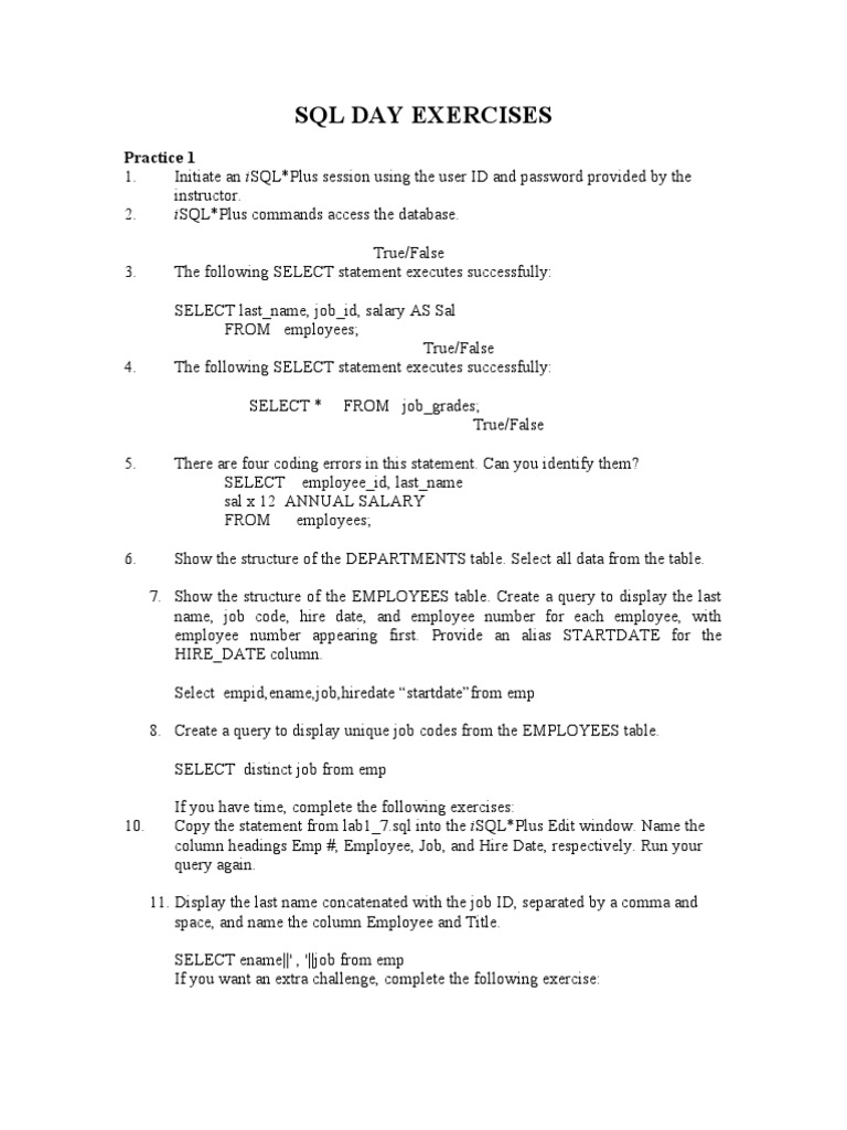Practice 1 1. Initiate an iSQL*Plus session using the user ID and password provided by the instructor. 2. iSQL*Plus commands access the database. 3. True/False The following SELECT statement executes successfully: SELECT last_name, job_id, salary AS Sal FROM employees; True/False The following SELECT statement executes successfully: SELECT * 5. FROM job_grades; True/False