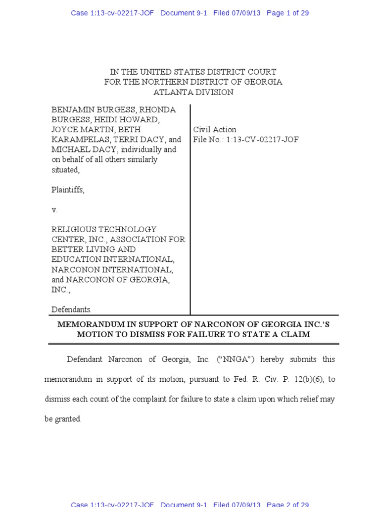 Defendant Narconon of Georgia, Inc. (“NNGA”) hereby submits thismemorandum in support of its motion, pursuant to Fed. R. Civ. P. 12(b)(6), todismiss each count of the complaint for failure to state a claim upon which relief may be granted.