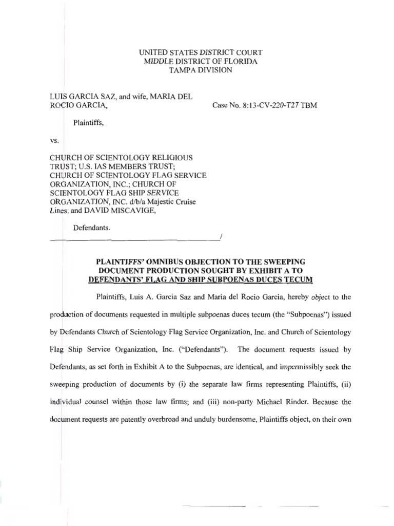 PLAINTIFFS OMNIBUS OBJECTION TO THE SWEEPING DOCUMENT PRODUCTION SOUGHT BY EXHIBIT A TO DEFENDANTS FLAG AND SHIP SUBPOENAS DUCES TECUM