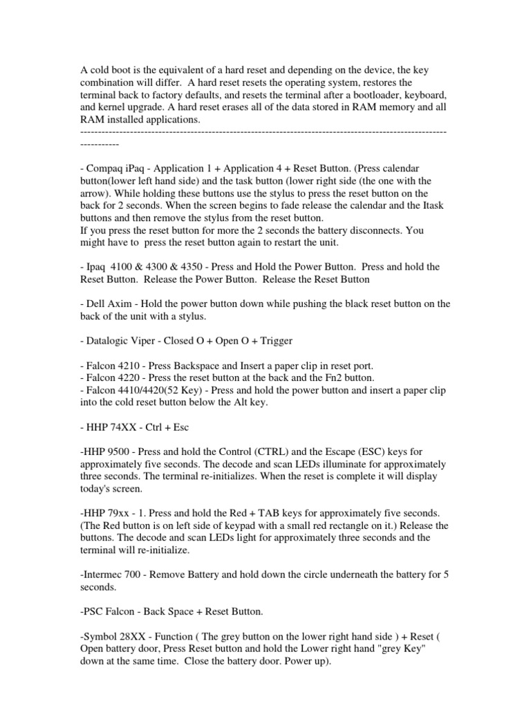 A hard reset resets the operating system, restores the terminal back to factory defaults, and resets the terminal after a bootloader, keyboard, and kernel upgrade. A hard reset erases all of the data stored in RAM memory and all RAM installed applications. ----------------------------------------------------------------------------------------------------------------- Compaq iPaq - Application 1 + Application 4 + Reset Button. (Press calendar button(lower left hand side) and the task button (lower right side (the one with the arrow). While holding these buttons use the stylus to press the reset button on the back for 2 seconds. When the screen begins to fade release the calendar and the Itask buttons and then remove the stylus from the reset button. If you press the reset button for more the 2 seconds the battery disconnects. You might have to press the reset button again to restart the unit. - Ipaq 4100 & 4300 & 4350 - Press and Hold the Power Button. Press and hold the Reset Button. Release the Power Button. Release the Reset Button - Dell Axim - Hold the power button down while pushing the black reset button on the back of the unit with a stylus. - Datalogic Viper - Closed O + Open O + Trigger - Falcon 4210 - Press Backspace and Insert a paper clip in reset port. - Falcon 4220 - Press the reset button at the back and the Fn2 button. - Falcon 4410/4420(52 Key) - Press and hold the power button and insert a paper clip into the cold reset button below the Alt key. - HHP 74XX - Ctrl + Esc -HHP 9500 - Press and hold the Control (CTRL) and the Escape (ESC) keys for approximately five seconds. The decode and scan LEDs illuminate for approximately three seconds. The terminal re-initializes. When the reset is complete it will display today's screen. -HHP 79xx - 1. Press and hold the Red + TAB keys for approximately five seconds. (The Red button is on left side of keypad with a small red rectangle on it.) Release the buttons. The decode and scan LEDs light for approximately three seconds and the terminal will re-initialize. -Intermec 700 - Remove Battery and hold down the circle underneath the battery for 5 seconds. -PSC Falcon - Back Space + Reset Button. -Symbol 28XX - Function ( The grey button on the lower right hand side ) + Reset ( Open battery door, Press Reset button and hold the Lower right hand "grey Key" down at the same time. Close the battery door. Power up).