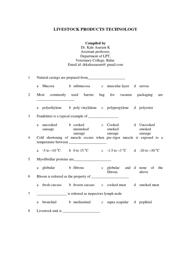 A minimum of ______________ nitrite is necessary to ensure normal colour and flavour in cured meats. a 20 40 ppm b 100 ppm c 200 ppm d 10 ppm Bound water forms about ___________ % of the total water content in meat a 10 % b 5% c 20 % d 25 % Ultimate pH of meat protein is___________________ a 4.5 b 5.4 c 5 The moisture content of AFD meat is __________________ a 2% b 10% c 15%