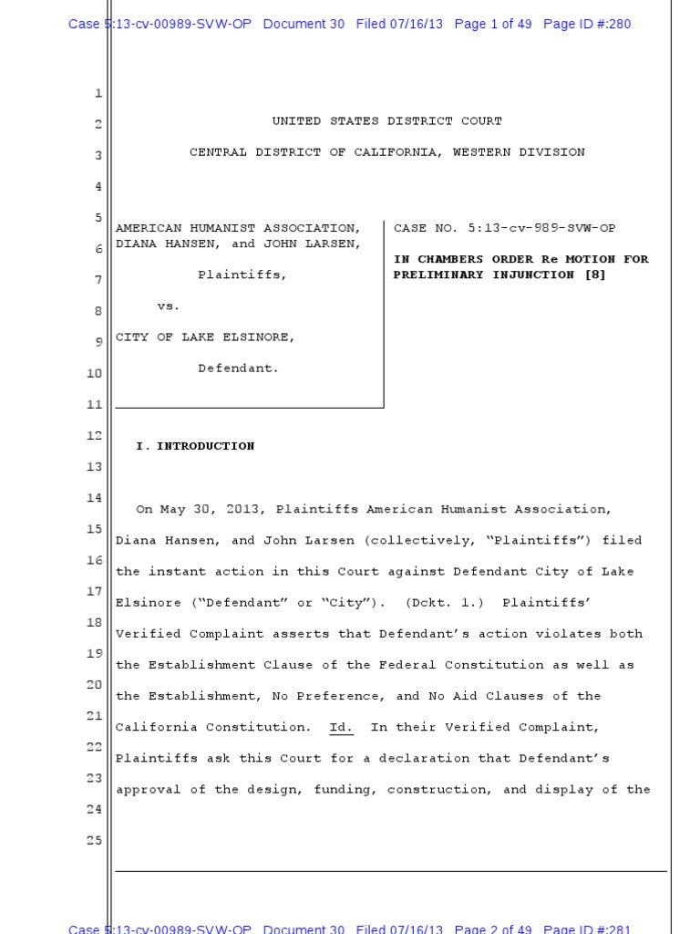 1 2 3 4 5 AMERICAN HUMANIST ASSOCIATION, 6 DIANA HANSEN, and JOHN LARSEN, 7 8 vs. Plaintiffs, CASE NO. 5:13-cv-989-SVW-OP IN CHAMBERS ORDER Re MOTION FOR PRELIMINARY INJUNCTION [8] UNITED STATES DISTRICT COURT CENTRAL DISTRICT OF CALIFORNIA, WESTERN DIVISION
