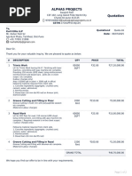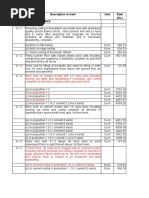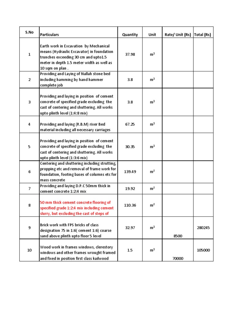 Particulars Earth work in Excavation by Mechanical means (Hydraulic Excavator) in foundation trunches exceeding 30 cm and upto1.5 meter in depth 1.5 meter width as well as 10 sqm on plan . Providing and Laying of Nallah stone bed including hamming by hand hammer complete job Providing and laying in position of cement concrete of specified grade excluding the cast of centering and shuttering. All works upto plinth level ([Link] mix) Providing and laying (R.B.M) rixer Bed material including all necessary carriages Providing and laying in position of cement concrete of specified grade excluding the cast of centering and shuttering. All works upto plinth level ([Link] mix) Centering and shuttering including strutting, propping etc and removal of frame work for foundation, footing bases of columns etc for mass concrete Providing and laying D.P.C 50mm thick in cement concrete [Link] mix 50 mm thick cement concrete flooring of specified grade [Link] mix including cement slurry, but excluding the cast of steps of Brick work with FPS bricks of class designation 75 in 1:6( cement 1:6) coarse sand above plinth upto floor 5 level Wood work in frames windows, clerestory windows and other frames wrought framed and fixed in position first class kailwood
