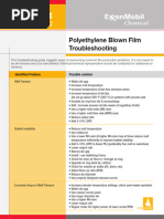 Clarity Film clarity improves with increasing processing temperatures and faster film cooling. However, if air velocity is too high, the bubble may chatter and clarity will be affected. Antiblocking agents also can reduce film clarity. Environmental Stress Crack Resistance Other than minimizing the heat history of the resin i.e., reducing the amount of regrind mixed with virgin resin, there is little that can be done via processing variables to improve ESCR. Resin choice is the most important factor. Gauge Uniformity The problem of poor gauge uniformity in blown film is quite common. If variation in gauge around the circumference of extruded film is less than 10%, there is no problem. If it exceeds this level, corrective steps should be taken because film of uniform gauge looks better and has generally superior physical properties. Heavier gauge areas on one side of a film appear as humps on a roll that not only impair film appearance, but may actually stretch it in the area of the hump. Film thus deformed may be difficult to handle on packaging equipment and to heat seal. Poor bubble stability, film wrinkling and take off problems are early indicators of uneven gauge. With thin films, uneven gauge results in tears and snap-offs. Gusseting also is harder to control when gauge variations are excessive. Non-uniform melt temperature may result in non-uniform film gauge and other defects. Overheated melt may come out of the die too fluid and the resultant film may be difficult to cool and wind up. Poor mixing may also result in nonuniform film thickness. Film of nonuniform gauge, in turn, results