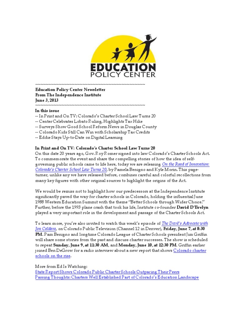 and On TV: Colorados Charter School Law Turns 20 -- Center Celebrates Lobato Ruling, Highlights Tax Hike -- Surveys Show Good School Reform News in Douglas County -- Colorado Kids Still Can Win with Scholarship Tax Credits -- Eddie Stays Up-to-Date on Digital Learning In Print and On TV: Colorados Charter School Law Turns 20 On this date 20 years ago, Gov. Roy Romer signed into law Colorados Charter Schools Act. To commemorate the event and share the compelling stories of how the idea of selfgoverning public schools came to life here, today we are releasing On the Road of Innovation: Colorados Charter School Law Turns 20, by Pamela Benigno and Kyle Morin. This pageturner, unlike any we have released before, combines careful and colorful recollections from many key figures with other original sources to highlight the origins of the Act. We would be remiss not to highlight how our predecessors at the Independence Institute significantly paved the way for charter schools in Colorado, holding the influential June 1988 Western Education Summit with the theme Better Schools through Wider Choice. Further, before the 1993 plane crash that took his life, Institute co-founder David DEvelyn played a very important role in the development and passage of the Charter Schools Act. To learn more, youre also invited to watch this weeks episode of The Devils Advocate with Jon Caldara, on Colorado Public Television (Channel 12 in Denver), Friday, June 7, at 8:30 PM. Pam Benigno and longtime Colorado League of Charter Schools president Jim Griffin will share some stories from the past and discuss charter successes. The show is scheduled to repeat Sunday, June 9, at 11:30 AM, and Monday, June 10, at 12:30 PM. Griffin earlier joined Ben DeGrow for a radio interview about a new report that shows Colorado charter schools on the rise. More from Ed Is Watching: State Report Shows Colorado Public Charter Schools Outpacing Their Peers Passing Thoughts: Charters Well Established Part of Colorados Education Landscape