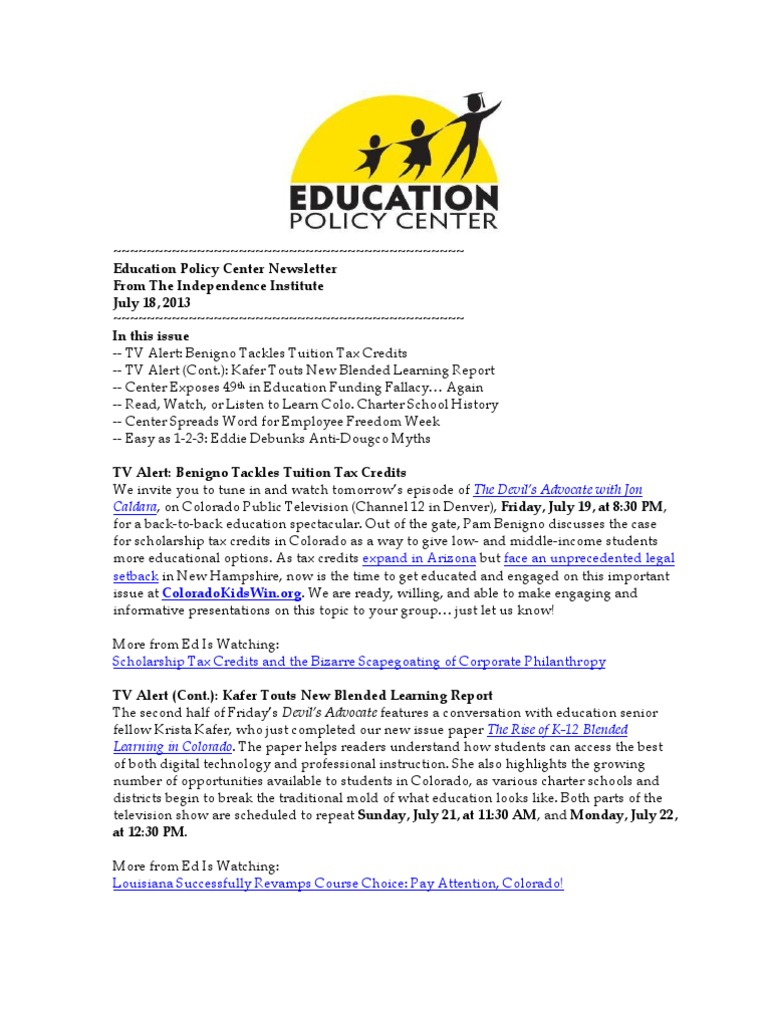 -- TV Alert: Benigno Tackles Tuition Tax Credits -- TV Alert (Cont.): Kafer Touts New Blended Learning Report -- Center Exposes 49th in Education Funding Fallacy Again -- Read, Watch, or Listen to Learn Colo. Charter School History -- Center Spreads Word for Employee Freedom Week -- Easy as 1-2-3: Eddie Debunks Anti-Dougco Myths TV Alert: Benigno Tackles Tuition Tax Credits We invite you to tune in and watch tomorrows episode of The Devils Advocate with Jon Caldara, on Colorado Public Television (Channel 12 in Denver), Friday, July 19, at 8:30 PM, for a back-to-back education spectacular. Out of the gate, Pam Benigno discusses the case for scholarship tax credits in Colorado as a way to give low- and middle-income students more educational options. As tax credits expand in Arizona but face an unprecedented legal setback in New Hampshire, now is the time to get educated and engaged on this important issue at ColoradoKidsWin.org. We are ready, willing, and able to make engaging and informative presentations on this topic to your group just let us know! More from Ed Is Watching: Scholarship Tax Credits and the Bizarre Scapegoating of Corporate Philanthropy TV Alert (Cont.): Kafer Touts New Blended Learning Report The second half of Fridays Devils Advocate features a conversation with education senior fellow Krista Kafer, who just completed our new issue paper The Rise of K-12 Blended Learning in Colorado. The paper helps readers understand how students can access the best of both digital technology and professional instruction. She also highlights the growing number of opportunities available to students in Colorado, as various charter schools and districts begin to break the traditional mold of what education looks like. Both parts of the television show are scheduled to repeat Sunday, July 21, at 11:30 AM, and Monday, July 22, at 12:30 PM. More from Ed Is Watching: Louisiana Successfully Revamps Course Choice: Pay Attention, Colorado!