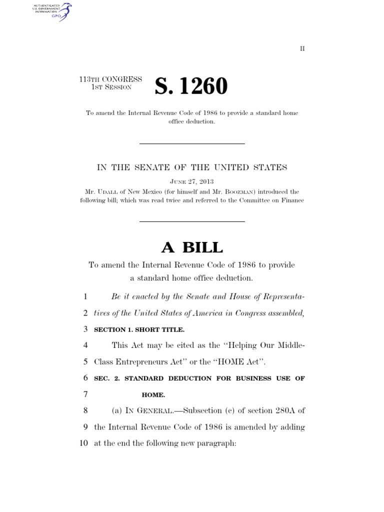 To amend the Internal Revenue Code of 1986 to provide a standard home office deduction.