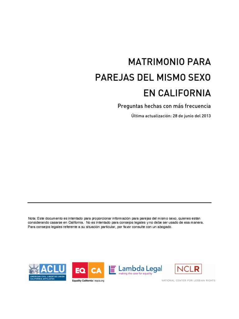 , parejas del mismo sexo en California otra vez tendrán la libertad de casarse. La Proposición 8, una enmienda a la constitución de California que despojo a las parejas del mismo sexo de la libertad de casarse, muy pronto será borrada de los libros e inejecutable. En el 26 de Junio del 2013, La Corte Suprema de los Estados Unidos decidió que los proponentes de la Proposición 8 no tenían el derecho legal para apelar la decisión de la corte federal que dijo que la Proposición 8 era inconstitucional. La Corte justificó su decisión con la razón que dando el derecho para casarse a parejas del mismo sexo no causaba ningún daño a los proponentes de la Proposición 8. Esta decisión histórica devolvió el derecho para casarse a las parejas del mismo sexo en California. Adicionalmente, la Corte Suprema rechazó la Sección 3 de la Ley Defendiendo el Matrimonio, conocida en ingles por sus siglas, DOMA, que hubiera requerido que el gobierno federal tratara a las parejas del mismo sexo como si fueran parejas de hecho. La supuesta ley también hubiera prohibido a las parejas del mismo sexo los beneficios federales, protecciones, y responsabilidades basadas en el matrimonio. La Corte decidió que la Sección 3 de DOMA violaba la igualdad que nuestra Constitución garantiza.