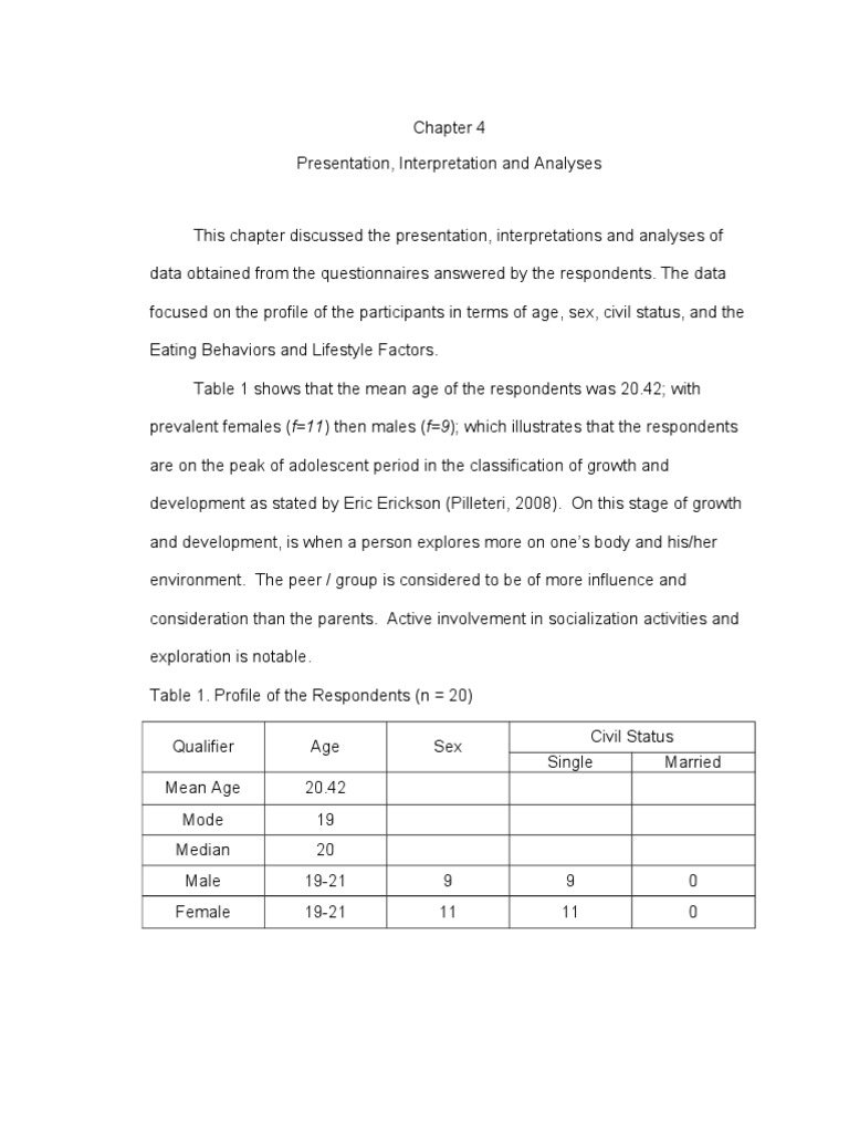 This chapter discussed the presentation, interpretations and analyses of data obtained from the questionnaires answered by the respondents. The data focused on the profile of the participants in terms of age, sex, civil status, and the Eating Behaviors and Lifestyle Factors. Table 1 shows that the mean age of the respondents was 20.42; with prevalent females (f=11) then males (f=9); which illustrates that the respondents are on the peak of adolescent period in the classification of growth and development as stated by Eric Erickson (Pilleteri, 2008). On this stage of growth and development, is when a person explores more on ones body and his/her environment. The peer / group is considered to be of more influence and consideration than the parents. Active involvement in socialization activities and exploration is notable. Table 1. Profile of the Respondents (n = 20) Qualifier Mean Age Mode Median Male Female Age 20.42 19 20 19-21 19-21 9 11 9 11 0 0 Sex Civil Status Single Married