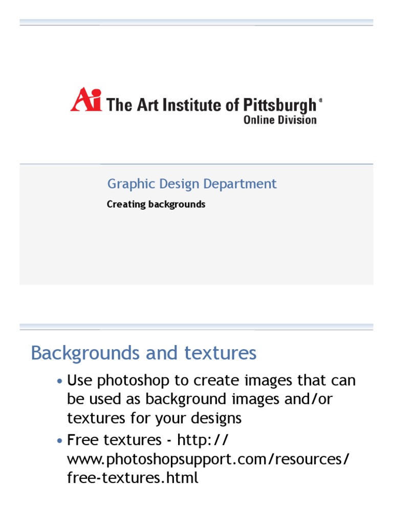 photoshop to create images that can be used as background images and/or textures for your designs Free textures - http:// www.photoshopsupport.com/resources/ free-textures.html